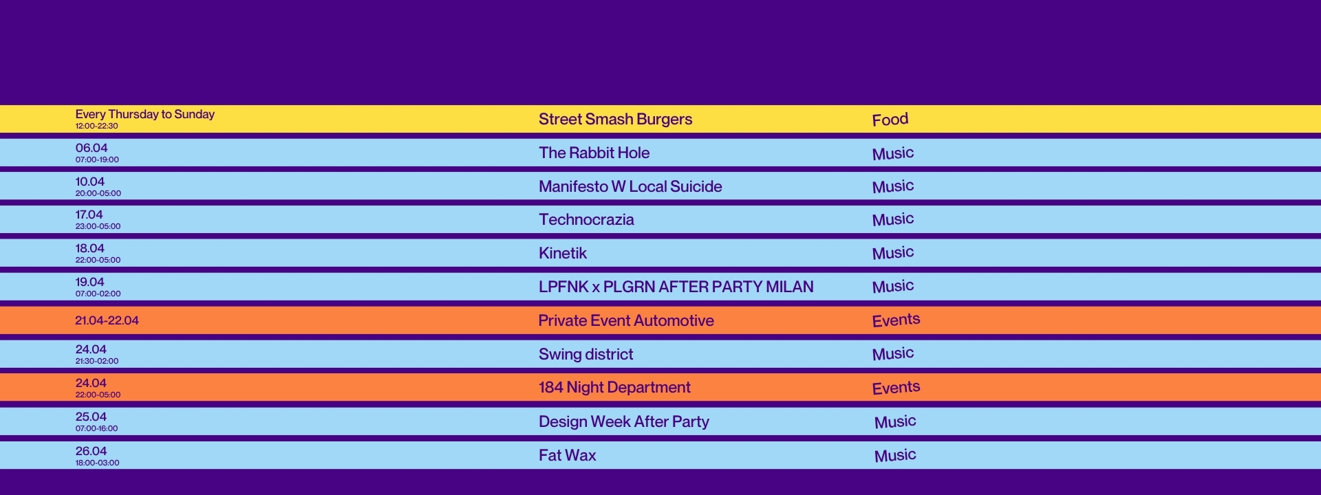 NEXT EVENTS - Club Dept 184 - 17.04.2026 Technocrazia - 17.04.2026 Kinetik - 24.04.2026 Swing district